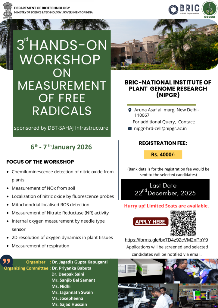 “3rd Hands-on workshop on measurement of free radicals” under DBT-SAHAJ platform for measurement of free radicals (PMFR)By NIPGR / December 7, 2025 January 6 – 7, 2026