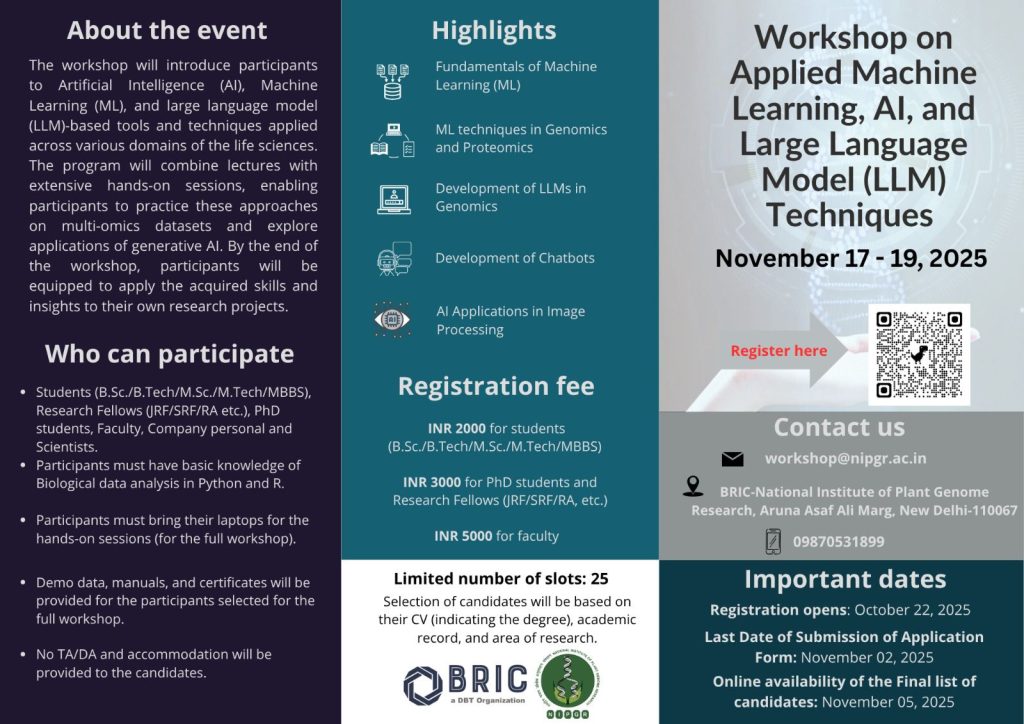 The workshop will introduce participants to AI, Machine Learning (ML), and large language model (LLM)-based tools and techniques applied across various domains of the life sciences. The program will combine lectures with extensive hands-on sessions, enabling participants to practice these approaches on multi-omics datasets and explore applications of Generative AI. By the end of the workshop, participants will be equipped to apply the skills and insights they have acquired to their own research projects.
