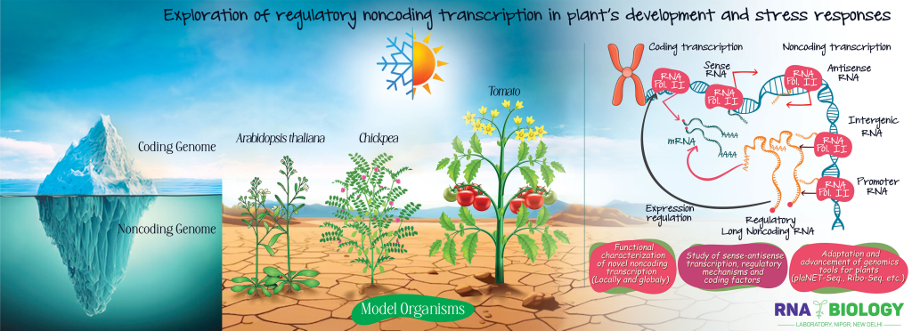 Some of the primary research directions in our RNA biology group at NIPGR, New Delhi include investigations into i) the identification and functional characterization of novel regulatory lncRNAs, ii) study of biologically important noncoding RNA mediated genome-wide transcriptional behaviors, and iii) investigations into whether lncRNAs adapt general regulatory mechanisms, for example, antisense lncRNAs as a class iv) application, adaptation and advancement of novel genomics tools in plants.